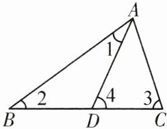 1. 如图,在△ABC中,D是BC上一点,∠1 = ∠2,∠3 = ∠4,∠BAC = 63°,则∠DAC = ________。