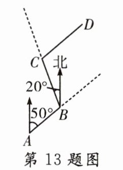 13.(教材P54习题T9变式)某县积极推进“乡村振兴计划”,要对一段水渠进行扩建。如图,已知现有水渠从A地沿北偏东50°的方向到B地,从B地沿北偏西20°的方向到C 地.若CD//AB,则∠BCD的度数为( )
