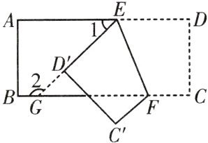 5. [几何直观、空间观念、推理能力、创新意识]如图,将一张长方形纸片ABCD沿EF折叠后,点D,C分别落在点D',C'的位置,ED'的延长线与BC相交于点G。设∠EFG = 68°,求∠1,∠2的度数。