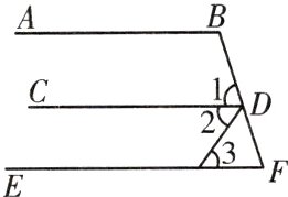 4. [几何直观、推理能力、模型观念]如图,直线AB,CD,EF被直线BF所截,∠B + ∠1 = 180°,∠2 = ∠3,试说明:∠B + ∠F = 180°。