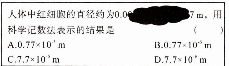 22. [真实问题情境]小华在做作业时,不小心把墨水洒在了习题上,如图所示,她翻看答案后知道本题答案选D,由此可知原数中小数点后“0”的个数为 ( )