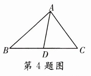 4.如图,AD是△ABC的中线,则点D是线段________的中点,BD = CD = $\frac{1}{2}$________,S△ABD = __________ = $\frac{1}{2}$__________,若S△ABD = 5,则S△ABC = ________。
