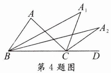 4. 如图,在△ABC中,∠A = 80°,延长BC到点D,∠ABC与∠ACD的平分线相交于点A1,∠A1BC与∠A1CD的平分线相交于点A2,依此类推,∠A4BC与∠A4CD的平分线相交于点A5,则∠A5的度数是________。