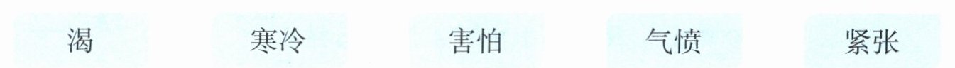 答案(示例): 渴:在太阳的炙烤下,我们在操场上跑了800米,渴得嗓子都冒烟了。 寒冷:凛冽的寒风吹在脸上,就像刀子割在脸上一样。 害怕:他害怕得面如土色,舌头都僵住了,一句话也说不出来。 气愤:他气愤到了极点,那两颗眼珠子气得都快要掉下来了。 紧张:揭晓胜负的时刻,我紧张得心都要蹦出嗓子眼了。