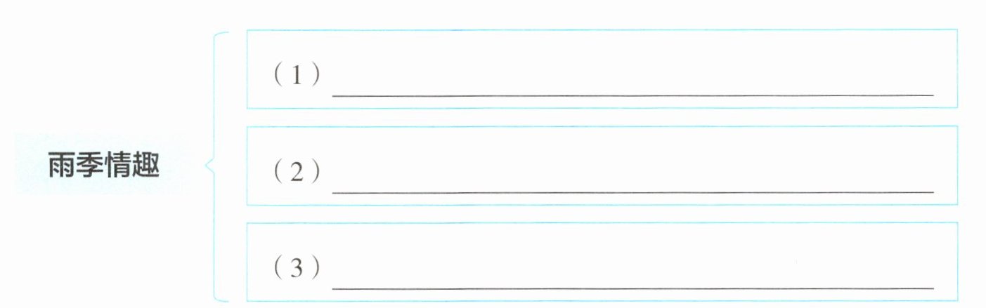 1.阅读短文第③ - ⑤自然段,梳理作者写了儿时雨季的哪些情趣(带来的乐趣或好处),了解作者借助具体事件表达情感的方法,完成下面的思维导图。(3分)