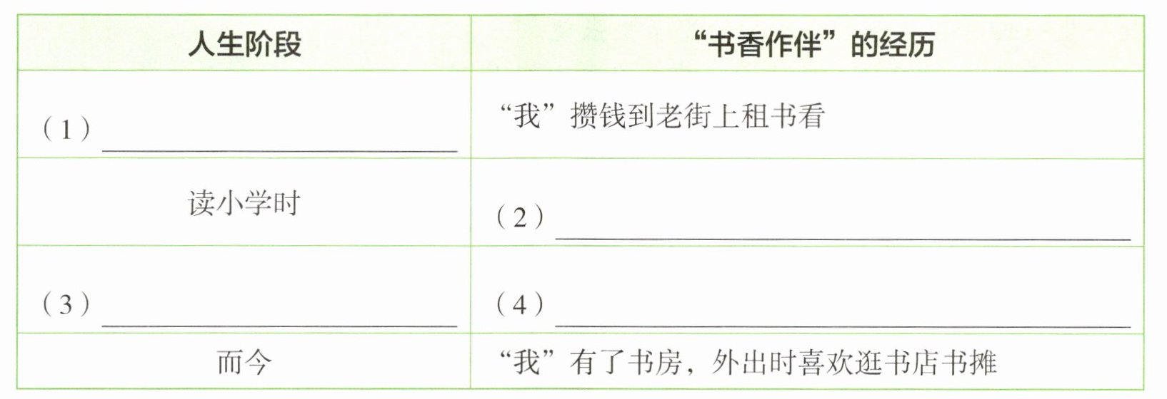 1. 文中的“我”在人生每个阶段都有“书香作伴”的经历。请仔细阅读全文,了解作者借助具体事件表达情感的方法,把表格补充完整。(4分)
