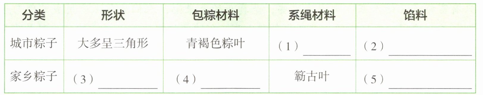 1 阅读短文,找出城市粽子和家乡粽子的区别,完成下面的表格。 (5分)