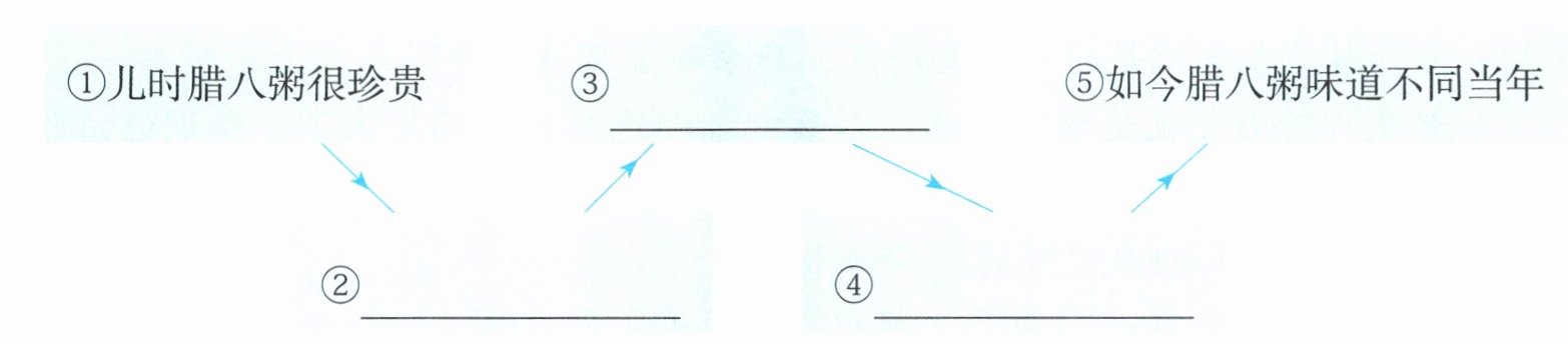 4.(示例)答:①因为儿时物资匮乏,生活不富裕,腊八粥只有在腊八节当天才能吃到,所以作者会觉得特别好吃;②儿时的腊八粥是母亲亲自熬制的,粥里融入了母亲的爱,有家的味道。所以,即使现在城市粥店里的腊八粥用料又多又好,可作者“总感到吃不出当年的味道了”。