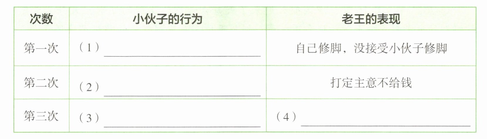 1. 本文记叙了小伙子为老王修脚的经过。请你阅读短文,完成下面的表格。(4分)