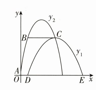 22. (9分)某数学兴趣小组进行项目式学习成果的展示,给出如下信息:在学校的巨幅宣传墙上,勤于动脑的小丽发现两条熟悉的抛物线,她依据环境,建立如图所示的平面直角坐标系,利用手边的工具,她不仅与同学合作进行力所能及的测量,还看到抛物线y₂上的两点B,C组成的线段恰好与学校的一处露台等高,于是通过采访总务处老师获得重要数据,他们发现:抛物线y₁的顶点C的纵坐标为40,y₁与x轴相交于点D(5,0),E(45,0)。抛物线y₂刚好过y₁的顶点C,且与y轴相交于点A(0,2.5),平行于x轴的线段BC长为20。根据以上信息,请你解决如下问题。