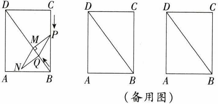 ∴$\frac{NQ}{DA}$ = $\frac{BQ}{BA}$,即$\frac{\frac{3}{5}(8 - t)}{8}$ = $\frac{t}{6}$。