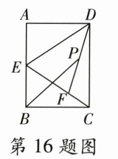 16.如图,在矩形ABCD中,AD = 3,AB = 4,E是AB的中点,F是EC上一动点,P为DF的中点,连接PB,则线段PB的最小值为________。