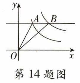 14.如图,已知反比例函数y = $\frac{5}{x}$和y = $\frac{k}{x}$(k>5)是在第一象限的图象,直线AB//x轴,直线AB与两个反比例函数图象分别交于点A,B。若S△AOB = 3,则k的值为________。