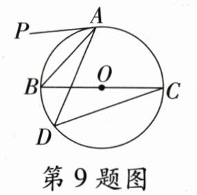 9.如图,BC是⊙O的直径,点A,D在⊙O上,直线PA与⊙O相切线于点A。若∠PAB=42°,则∠ADC 的度数为( )