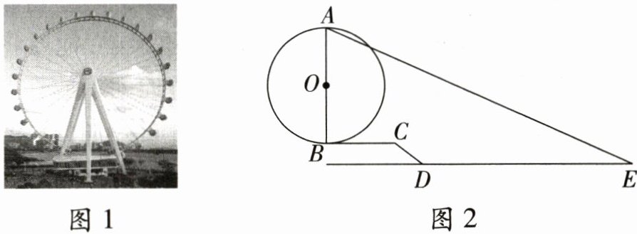 21.(8分)如图1是位于青岛的海景摩天轮“琴岛之眼”,游客可以在碧海蓝天之间领略大青岛的磅礴气势。图2是它的简化示意图,点O是摩天轮的圆心,AB是摩天轮垂直于地面的直径,小红在E处测得摩天轮顶端A的仰角为24°,她沿水平方向向左行走122m到达点D,再沿着坡度i = 0.75的斜坡走了20m到达点C,然后再沿水平方向向左行走40m到达摩天轮最低点B处(点A,B,C,D,E均在同一平面内),求摩天轮AB的高度。(结果保留整数,参考数据:sin24°≈0.41,cos24°≈0.91,tan24°≈0.45)