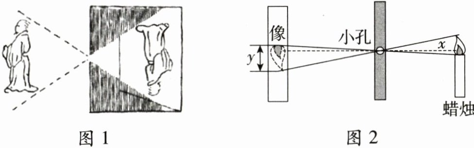 20.(6分)大约在两千四五百年前,墨子和他的学生做了世界上第1个小孔成像的实验,如图1,并在《墨经》中有这样的精彩记录:“景到,在午有端,与景长,说在端”。如图2,根据小孔成像的科学原理,当像距(小孔到像的距离)和物高(蜡烛火焰高度)不变时,火焰的像高y(单位:cm)是物距(小孔到蜡烛的距离)x(单位:cm)的反比例函数,当x = 6时,y = 2。