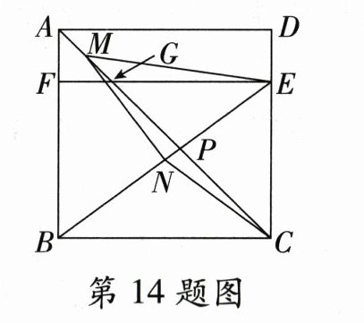 14. 如图,四边形ABCD是边长为4cm的正方形,点E在边CD上,DE = 1cm,过点E作EF//BC,分别交AC,AB于点G,F,M,N分别是AG,BE的中点,则下列5个结论中:①点F,N,C共线;②MN = $\frac{5}{2}$cm;③AC⊥BE;④△MNC的面积为$\frac{7}{8}$;⑤∠MEB = 45°。正确的结论是________(填写所有正确结论的序号)。