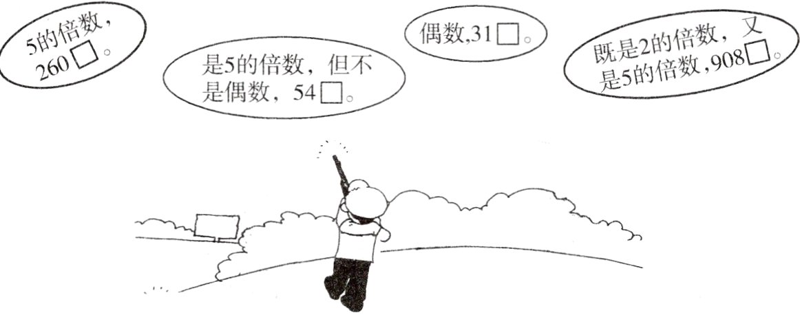 5的倍数,260□。 是5的倍数,但不是偶数,54□。 偶数,31□。 既是2的倍数,又是5的倍数,908□。