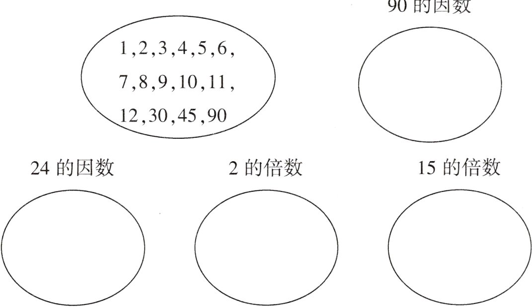 1.90的因数:1,2,3,5,6,9,10,30,45,90 24的因数:1,2,3,4,6,8,12 2的倍数:2,4,6,8,10,12,30,90 15的倍数:30,45,90