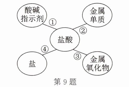 9. (2023·西安碑林段考)归纳是学习化学的重要方法,小红在复习盐酸的性质时,归纳出盐酸的4条化学性质(如图所示,连线表示相互能发生化学反应)。