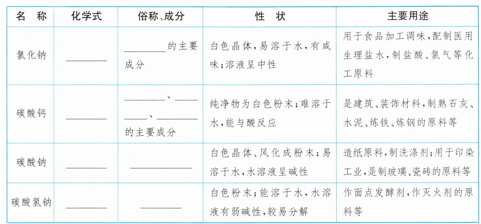 (从左到右,从上到下)$\mathrm{NaCl}$ 食盐 $\mathrm{CaCO_3}$ 石灰石 贝壳 大理石 $\mathrm{Na_2CO_3}$ 纯碱、苏打 $\mathrm{NaHCO_3}$ 小苏打