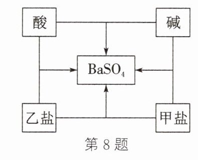 8. (2023·西安周至三模)小明在总结酸、碱、盐之间的相互反应关系时发现,选用适当的物质可以实现如图所示的所有反应。如果中间的物质为硫酸钡,那么下列对酸、碱、甲盐、乙盐四种物质的推断中,合理的是 ( )