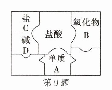 9. (2024·青岛莱西期末)如图是A、B、C、D和盐酸卡片的“化学拼图”,相邻两张卡片所标的物质(或其溶液)之间能发生化学反应。