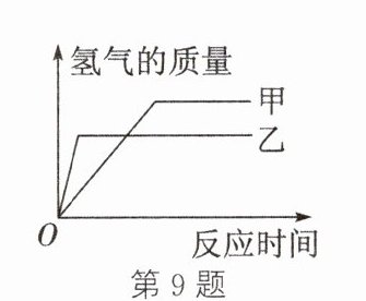 9. (2024·渭南澄城期末)现有等质量的甲、乙两种金属,分别放入浓度相同的足量稀硫酸中,产生氢气的质量与时间的关系如图(已知:甲、乙在生成物中的化合价均为+2)。下列说法不正确的是( )