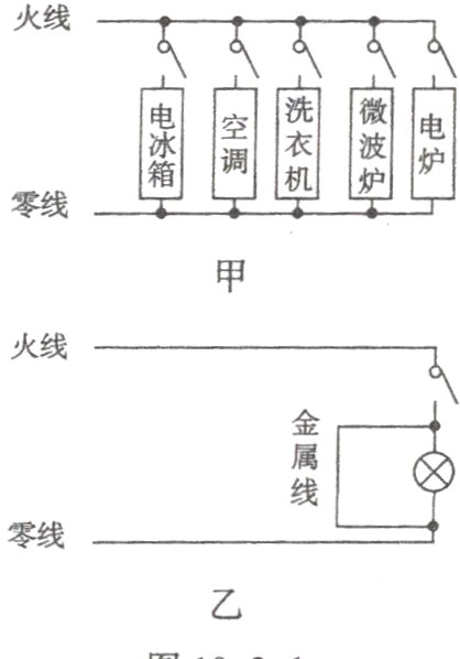 1. 如图19−2−1所示的甲、乙两个电路中,开关闭合后,输电线因电流过大而燃烧起来。甲图产生电流过大的原因是______________,乙图产生电流过大的原因是____________。
