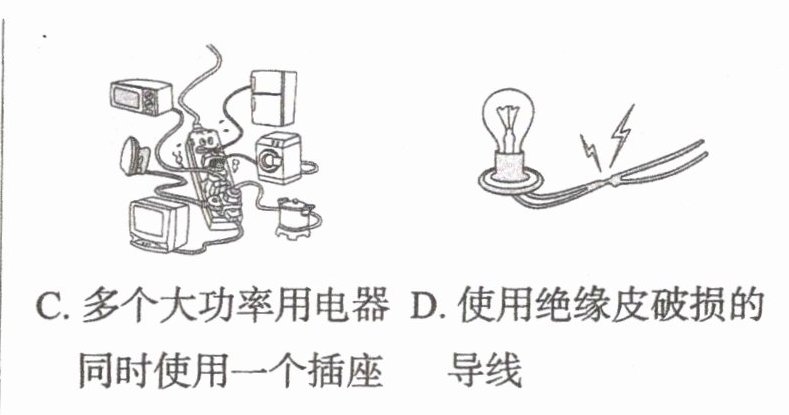 5.如图19−2所示,闭合开关S后,发现电灯L不亮,且保险丝没有熔断。某同学用试电笔测试图中A、B、C、D四处,发现A、C、D这三处都能使试电笔的氖管发光,而B处不发光。那么可以判定故障是( )