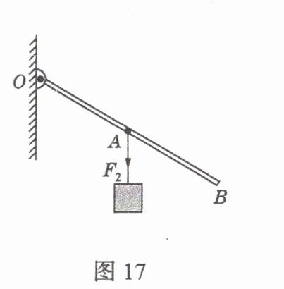 17. 图17中,用直棒提升重物,画出图示位置所用最小力F₁和阻力F₂的力臂l₂。