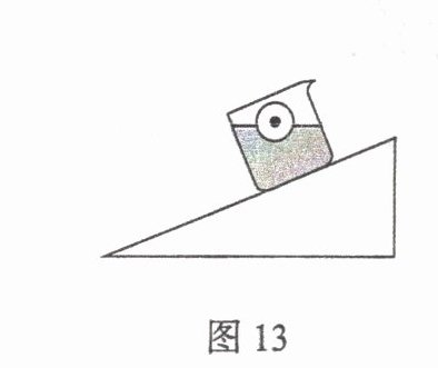 13. 如图13所示,一小球漂浮在盛水的烧杯中,将烧杯放置在斜面上,各物体均处于静止状态,请作出小球的受力示意图和烧杯对斜面压力的示意图(小球的重心已标出)。