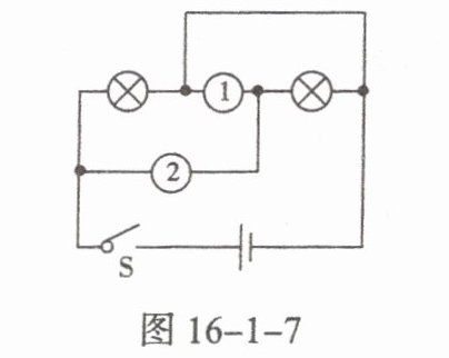 13.如图16−1−7所示,①②是测量电压或电流的仪表;当S闭合后,为了使小灯泡都能发光,则( )