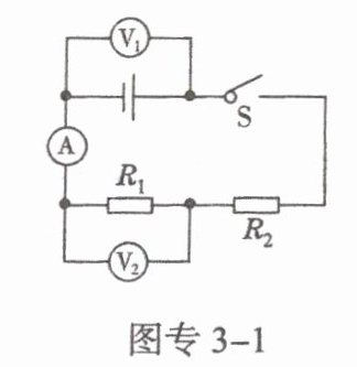 1. 如图专3−1所示的电路中,电源电压保持不变,闭合开关S,电压表V₁的示数为6V,V₂的示数为0V,由此可知,有可能存在R₁____________或R₂____________的电路故障。(均选填“短路”或“断路”)