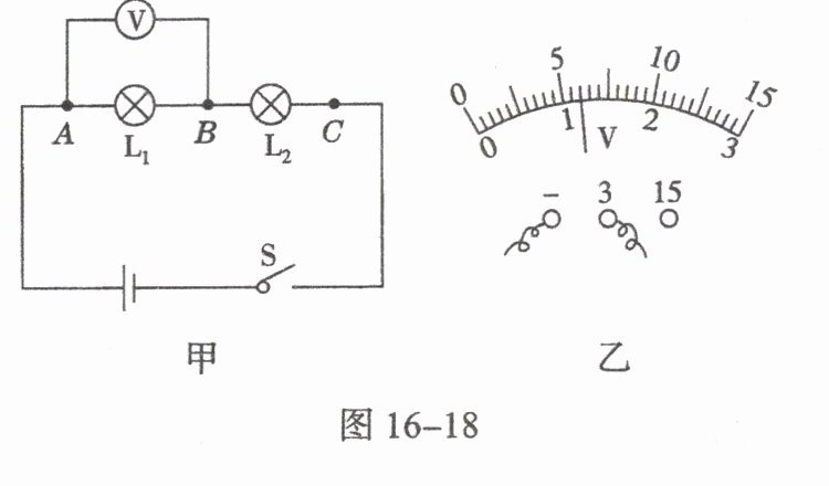 20.如图16−18甲所示电路图,电源是由两节新干电池串联接在一起的,闭合开关后灯泡L₁和L₂都能正常发光,电压表的示数如图乙所示,灯泡L₁中的电流为0.3A。求: