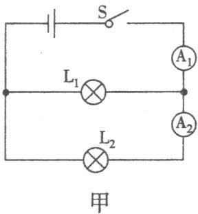 (2)由题图甲可知,两灯泡并联,电流表A₁测干路电流,电流表A₂测灯泡L₂所在支路电流,因此电流表A₁的示数大于A₂的示数。