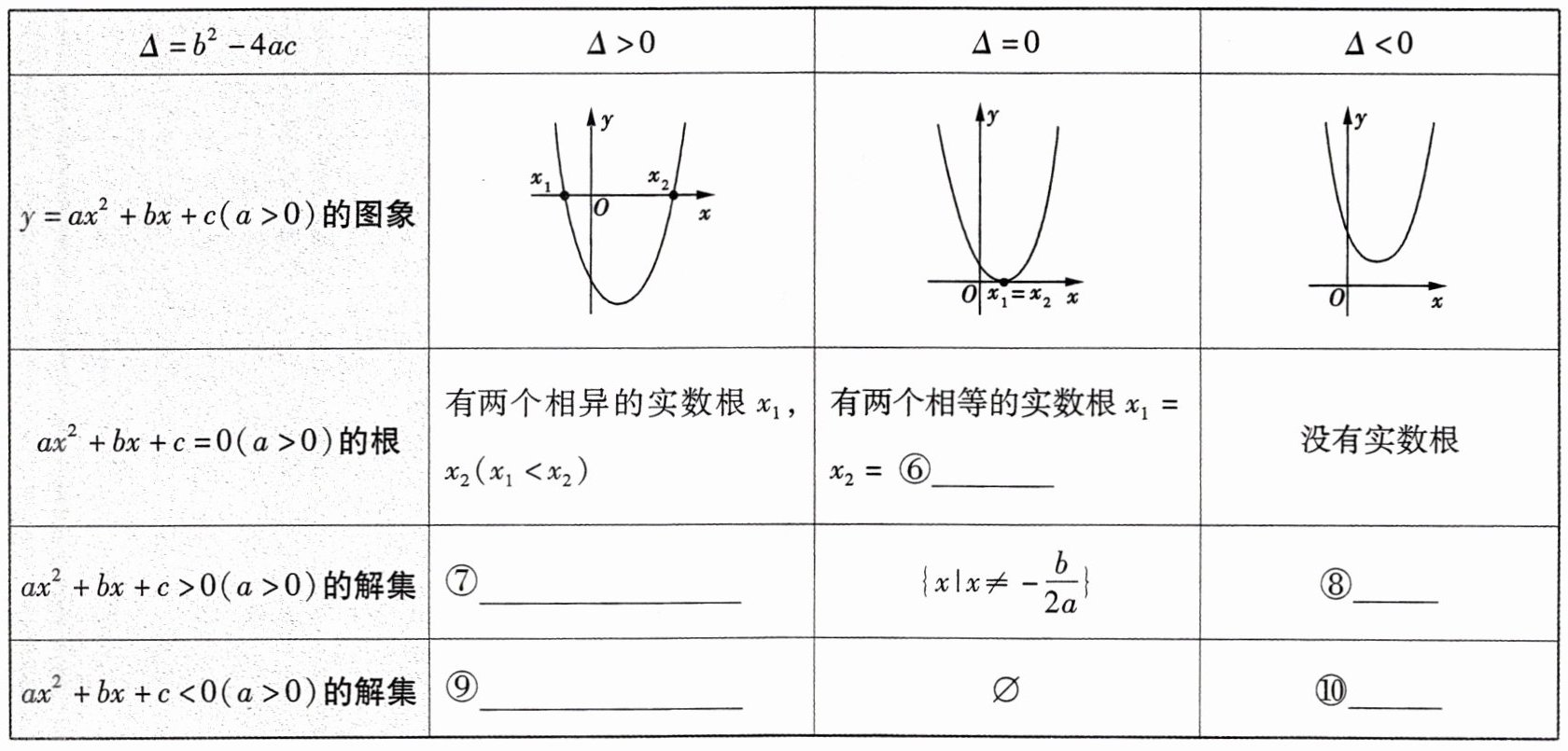 ⑥$-\frac{b}{2a}$ ⑦$\{x|x < x_1或x > x_2\}$ ⑧$\text{R}$ ⑨$\{x|x_1 < x < x_2\}$ ⑩$\varnothing$