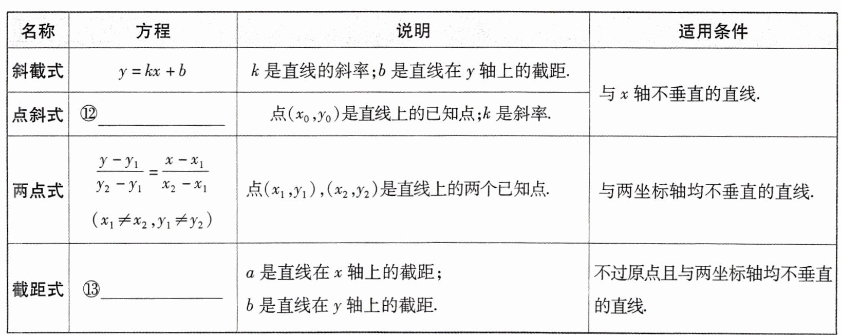 ⑫$y - y_{0}=k(x - x_{0})$ ⑬$\frac{x}{a}+\frac{y}{b}=1$