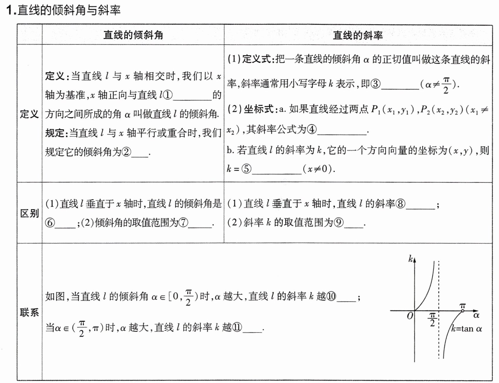 ①向上 ②$0^{\circ}$ ③$k = \tan\alpha$ ④$k_{P_{1}P_{2}}=\frac{y_{2}-y_{1}}{x_{2}-x_{1}}$ ⑤$\frac{y}{x}$ ⑥$\frac{\pi}{2}$ ⑦$[0,\pi)$ ⑧不存在 ⑨$\mathbf{R}$ ⑩大 ⑪大
