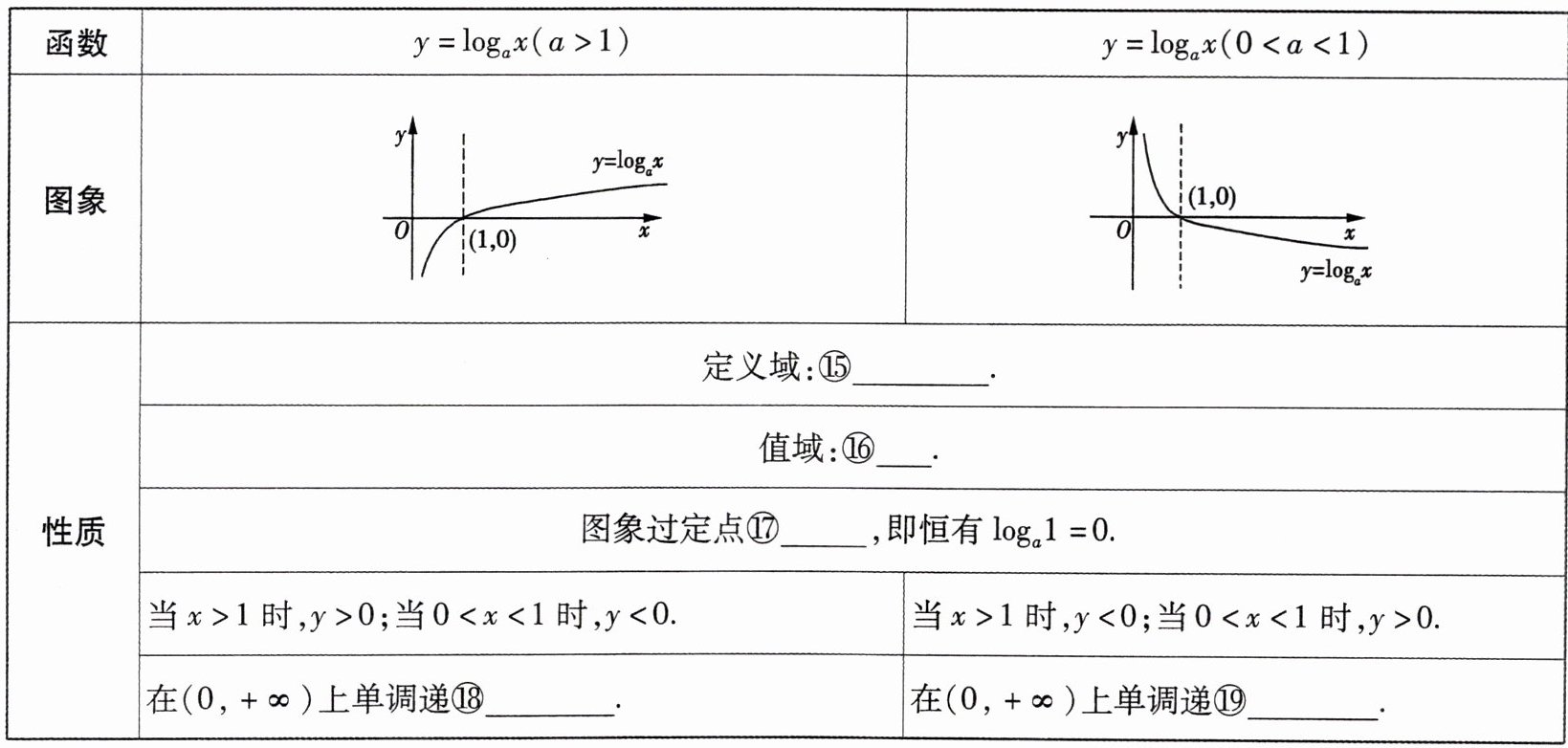 性质:$\log_{a}1 =$⑥____,$\log_{a}a =$⑦____,$a^{\log_{a}N} =$⑧____$(N > 0)$,其中$a > 0$,且$a\neq1$.