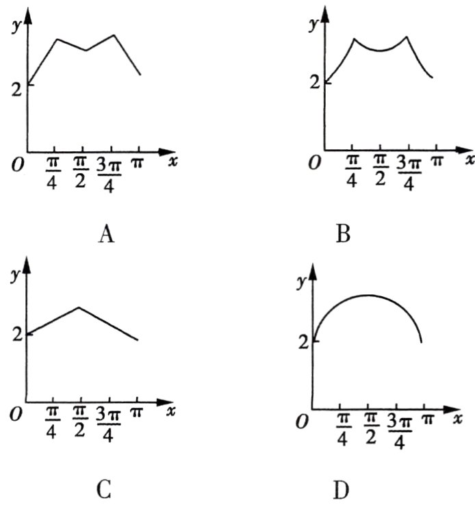 例3B 由题易知$f(0)=2$,$f(\frac{\pi}{4})=1+\sqrt{5}$,$f(\frac{\pi}{2})=2\sqrt{2}<f(\frac{\pi}{4})$,可排除选项C,D;当点$P$在边$BC$上时,$f(x)=BP + AP=\tan x+\sqrt{4+\tan^{2}x}(0\leqslant x\leqslant\frac{\pi}{4})$,不难发现$f(x)$的图象是非线性的,排除选项A,故选B.