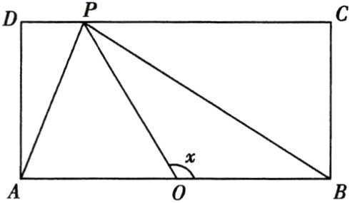 例3 如图,长方形$ABCD$的边$AB = 2$,$BC = 1$,$O$是$AB$的中点.点$P$沿着边$BC$,$CD$与$DA$运动,记$\angle BOP = x$.将动点$P$到$A$,$B$两点的距离之和表示为$x$的函数$f(x)$,则$y = f(x)$的图象大致为