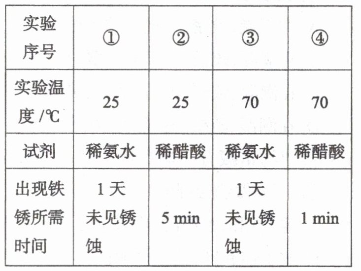 (4)酸的浓度(合理即可) 相同温度下,将两个相同的铁钉分别放入等体积、不同浓度的稀醋酸中,观察铁钉生锈时间(合理即可)