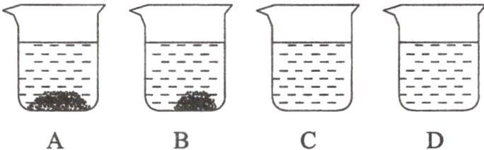 6. A、B、C、D四个烧杯中分别盛有质量相等的同种溶剂,在相同的温度下,向四个烧杯中加入20g、15g、10g、5g的某固体溶质,充分溶解后如图所示,回答下列问题。