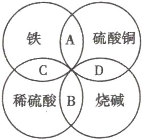 13. 如下所示两圆相交部分(A、B、C、D)可表示铁、稀硫酸、烧碱溶液、硫酸铜溶液间的反应关系,请按下列要求填空: