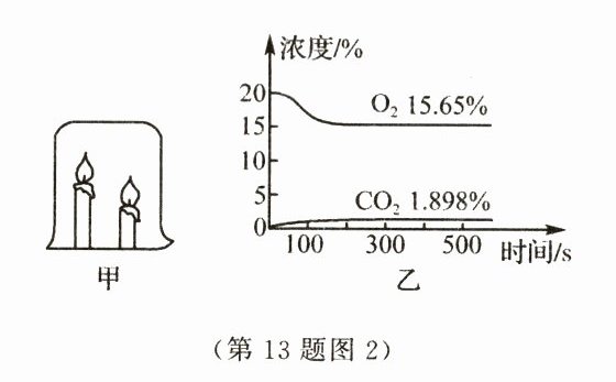 【资料Ⅱ】如图2,将氧气、二氧化碳传感器放入烧杯测量甲烧杯内两支蜡烛从点燃到全部熄灭后,杯内氧气、二氧化碳的浓度变化如图乙所示。