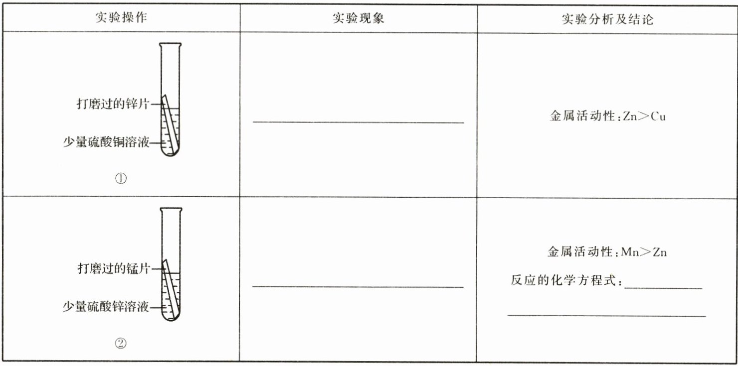 【解析】【设计并进行实验】②由实验结论可知,金属活动性:$Mn>Zn$,则Mn能把Zn从其化合物溶液中置换出来。