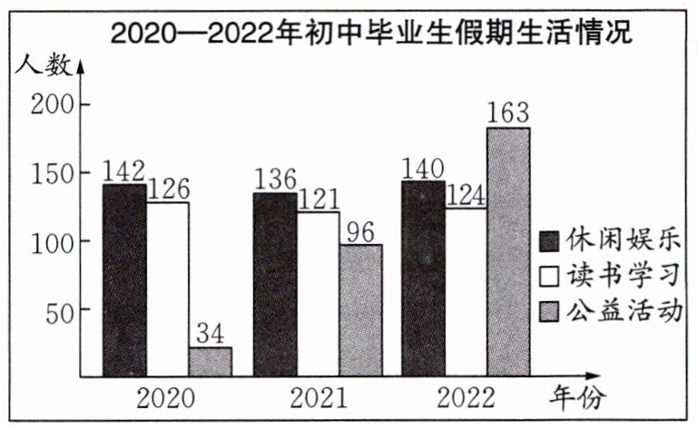 近三年,初中毕业生在假期休闲娱乐和读书学习的人数相对稳定(人数变化不大),从事公益活动的人数明显增加。