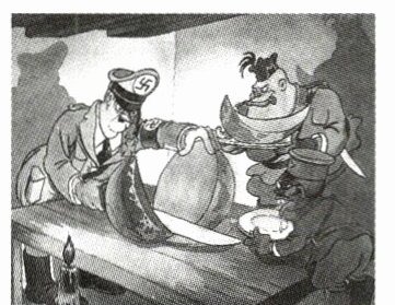 7.如图是20世纪40年代初期,美国媒体上的一幅漫画,漫画中的三个人物形象分别是希特勒、墨索里尼、广田弘毅,他们正在切瓜,而瓜皮上的纹理是一幅世界地图。如果给这幅漫画拟定一个题目,下列选项最合适的是 ( )