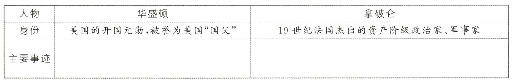 (2)华盛顿主要事迹:任北美大陆军总司令,领导美国取得独立战争的胜利;主持制定了1787年宪法;当选美国第一届、第二届总统。(答出两点即可,2分)拿破仑主要事迹:建立法兰西第一帝国;颁布《拿破仑法典》,巩固了法国大革命的成果,传播了资产阶级自由民主的思想,为其他国家制定民法提供了蓝本;发动对外战争,打击了欧洲的封建势力,但损害了被侵略国家人民的利益。(答出两点即可,2分)